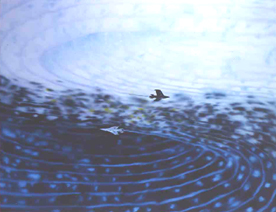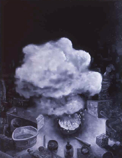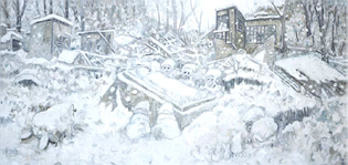 Suggérée, efficace, la tragédie.Avec ces instruments artistiques de précision, il peut ne pas hésiter à se mesurer à des subjets très étrange paysage. Des tour, il ne reste que la base aux parois d´chirées et hérissées de points. Des plantes recouvrent le sol. On les voit d´auntant mieux que la composition est construite selon un point de vue à ras de terre. Une bombe tombe en oblique .La scène est baignée d´une lumière verte plus aquatique qu´aérienne. La tragédie n´est pas véritablement montrée, mais insidieusement suggérée. Elle n´en est que plus afficace. Dans cet art du sous-entendu, Oiwa excelle. Les deux bateaux vont inévitablement être engloutis par le tourbillon qui, pour l´instant , ride la surface de l´océan. Un désert lunaire semé de cratères recouvre le toit d´un immeuble dont on s´aperçoit ensuite qu´il est celui du thé àtre Apollo de New York. La végétation croit et prolifère. L´hiver recouvre tout. C´est alors qu´apparait clairement le principe qui fait l´unité de ses œuvres apparemment hétérogènes: Oiwa peint le triomphe de la nature sur les entrepises humaines . Le triomphe ou, plus probablement, la revanche d´une nature fatiguée d´être méprisée et figurée.