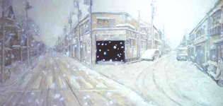 Ce qui se voit d´abord, c´est la remarquable diversité de ses subjets. Il peint un coin de banlicue sous la neige, deux navires allant en sens contraire, un plateau repas dans un avion de ligne, des champignons arborescents, Blache- Neige et les Sept Nains morts de froid. Chaque motif s´identifie immédiatement , mais aucune liason ne sétablit clairement d´une œuvre à l´autre: ni narrative ni symbolique. L´explication de cette variété tient en partie aux habitudes de l´artiste. Oiwa passe beaucoup de temps en promenade, dans les rues, devant les vitrines, dans les parcs. Il marche, regarde, enregistre, se souvient, rentre à l´atelier, prend des notes visuelles. Puis en fait des toiles. Le hasard, les heures, le temps qu´il fait, l´humeur du jour s´inscrivent dans le œuvres. Ils le peuvent parce qu´Oiwa jouit d´une évidente aisance picturale. Il est de ces artistes qui trouvent des solutions plastiques satisfaisantes et élégantes, qu´ils nient à représenter un maelström la neige qui tombe, des fleurs, n´importe quel object ou n´importe quel bátiment contemporains. Son dessin sait être à la fois détaillé et léger. Ses couleurs sont aussi légères, presque translucides, avec une prédilection visible pour les ocres, les gris, la blancheur. De temps en temps, avec quelque désinvolture humoristique, Oiwa ajoute de petits collages ou des paillettes qui accrochent la lumière - rien de systématique l à-dedans , juste des expériences réussies.