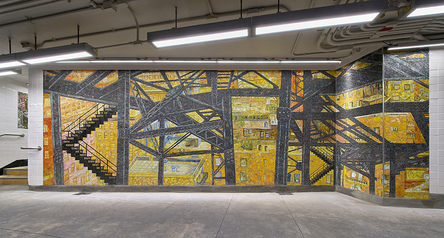 Woodside Window 2, 2025, glass mosaic, 239 x 738 cm / 94 x 290.5 inches , Commission work for MTA- Metropolitan Transport Authority, Northern Blvd Station, R and M line Subway station, New York.